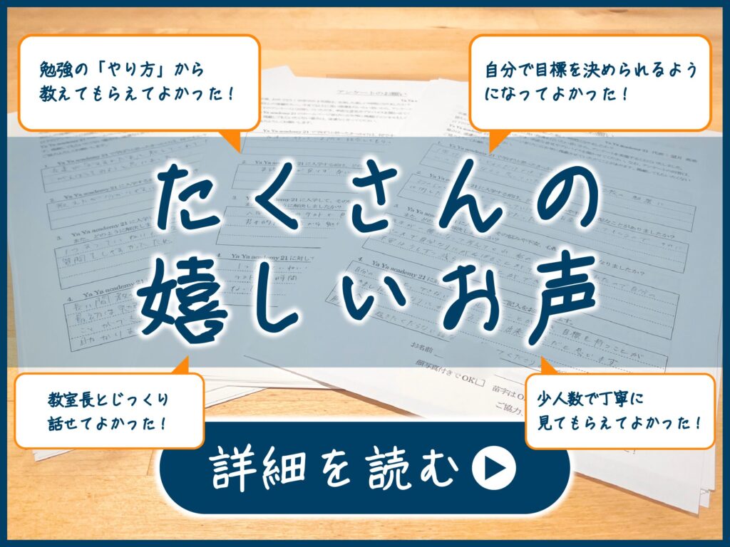 藤枝市岡部町の個別指導教室『Ya Ya academy 21』では、自分の力で勉強できる生徒を育てます。